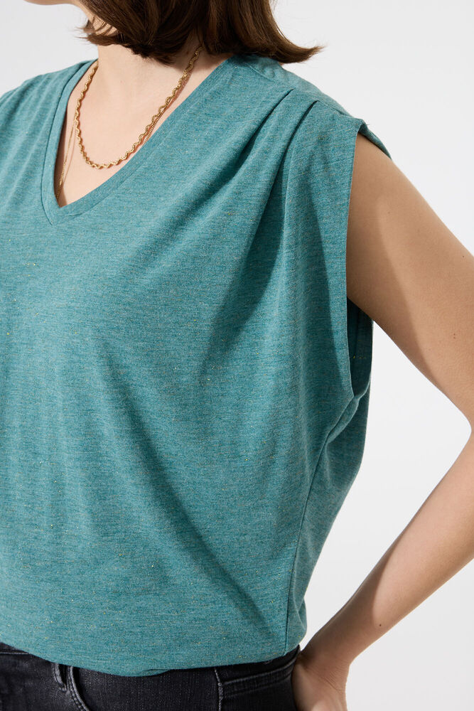 Stijlvol T-shirt met een vleugje glans. Dit T-shirt heeft een V-hals, korte kapmouwen en een regular fit. Dit item is gemaakt van 64% gerecycled polyester, 35% viscose en 1% metallic garen. Dit GARCIA kledingstuk is gemaakt met gebruik van recyclede garen. Recyclede materialen worden gemaakt uit restmateriaal, wat weer wordt omgezet tot grondstof.
