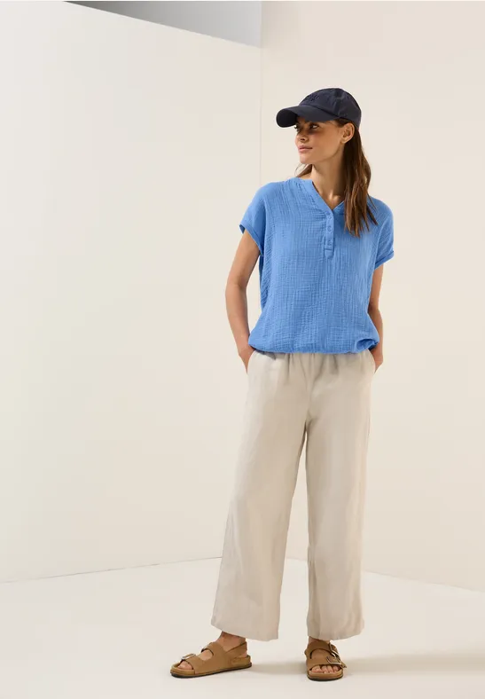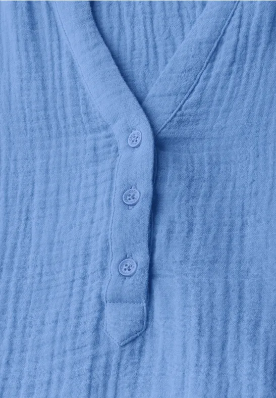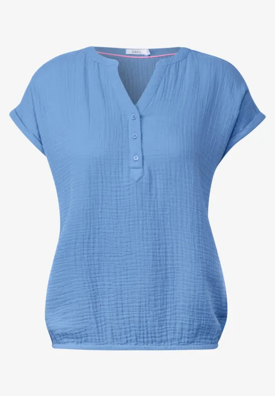 Deze mousseline blouse van CECIL voor dames heeft een luchtig model en een split in de hals met een decoratieve knoopsluiting. De elastische zoom zorgt voor een comfortabele pasvorm. Het zuivere katoen maakt deze blouse bijzonder comfortabel om te dragen.