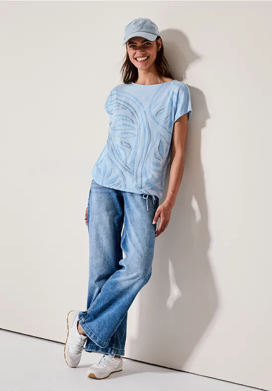 Dit CECIL Shirt voor dames heeft een grafisch patroon en een trendy drop-shoulder snit. Het koord aan de zoom geeft het Shirt een relaxte pasvorm, terwijl de zachte katoen-modaalmix comfortabel aanvoelt tegen de huid. Een nonchalante blikvanger voor je casual stijl.