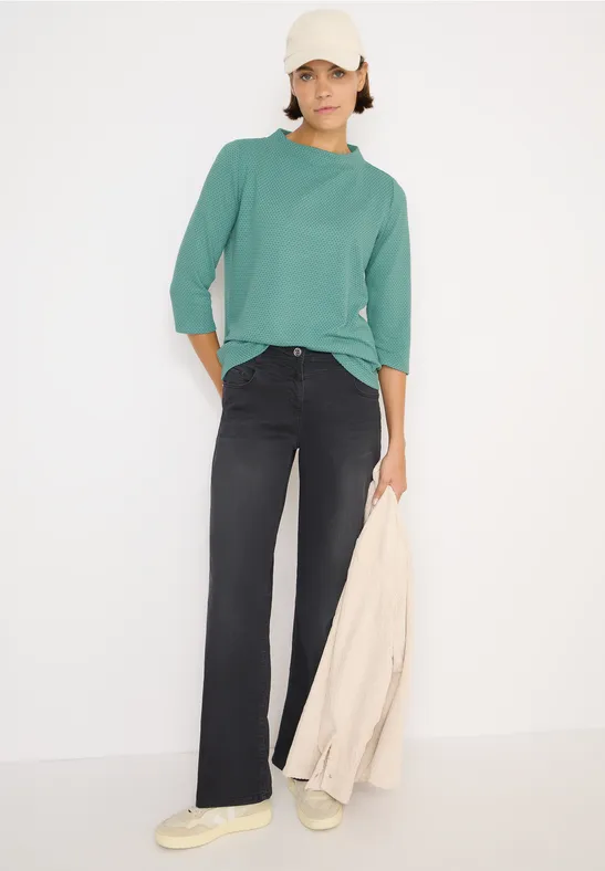 Dit Shirt met structuur van CECIL voor dames heeft een moderne trechtervormige hals en een subtiel structuurpatroon. De 3/4-mouwen en zachte viscosemix met stretch zorgen voor een comfortabele pasvorm. Ideaal voor stijlvolle alledaagse looks.