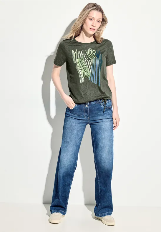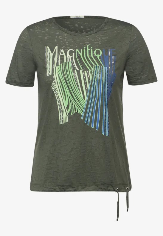 CECIL dames-T-shirt, burnout-patroon, trekkoord in de zoom, print op de voorkant, zachte materiaalmix