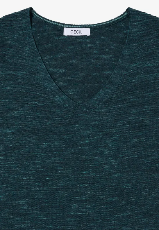 De V-hals trui in de stijl Heather van CECIL voor dames heeft een moderne gemêleerde look met zijsplitten voor meer bewegingsvrijheid. De V-hals en lange mouwen benadrukken de vrouwelijke snit. Een comfortabele klassieker voor ontspannen alledaagse outfits.