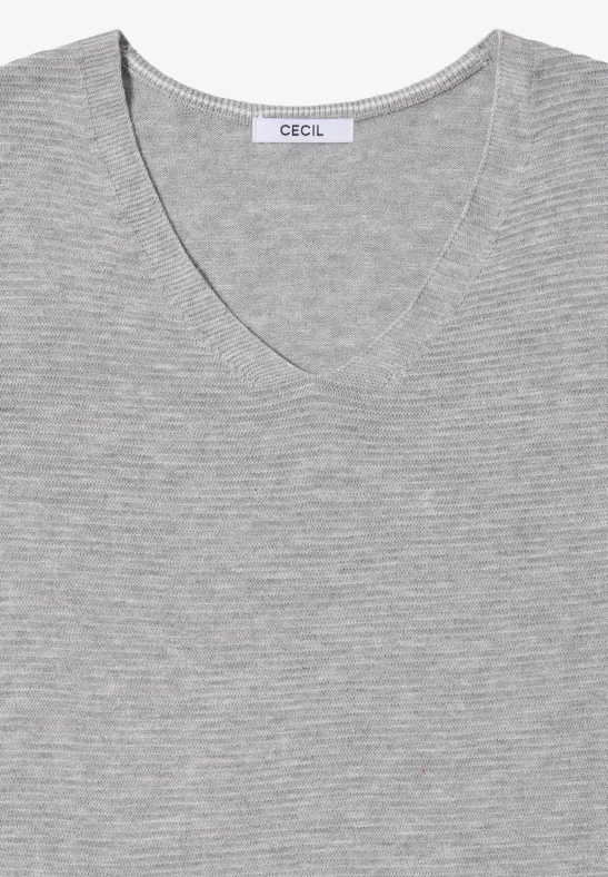 De V-hals trui in de stijl Heather van CECIL voor dames heeft een moderne gemêleerde look met zijsplitten voor meer bewegingsvrijheid. De V-hals en lange mouwen benadrukken de vrouwelijke snit. Een comfortabele klassieker voor ontspannen alledaagse outfits.