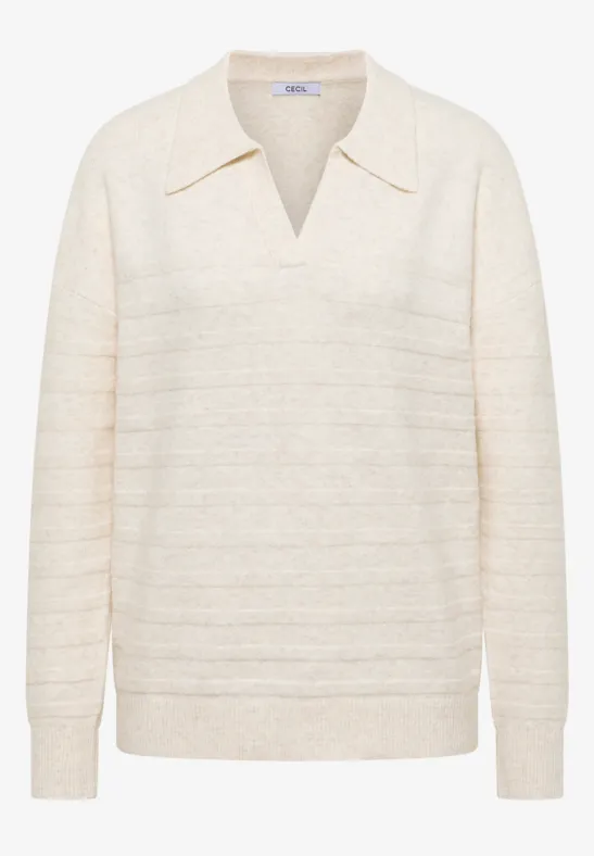 Met gestructureerde strepen en een polokraag zet deze gebreide trui van CECIL voor dames een modieuze toon. De lange mouwen en het behaaglijke gevoel zorgen voor fijne momenten. Een stijlvolle metgezel voor frisse dagen.