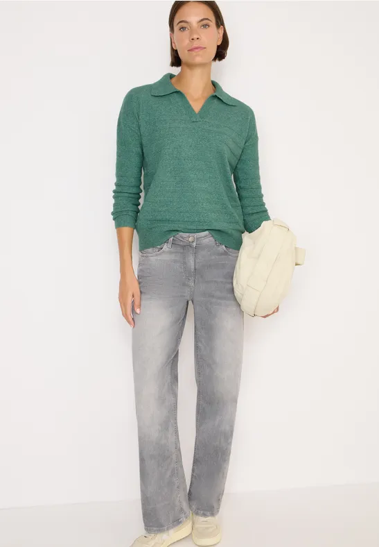 Met gestructureerde strepen en een polokraag zet deze gebreide trui van CECIL voor dames een modieuze toon. De lange mouwen en het behaaglijke gevoel zorgen voor fijne momenten. Een stijlvolle metgezel voor frisse dagen.