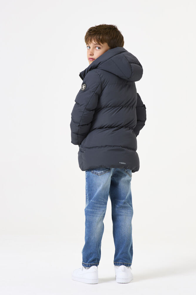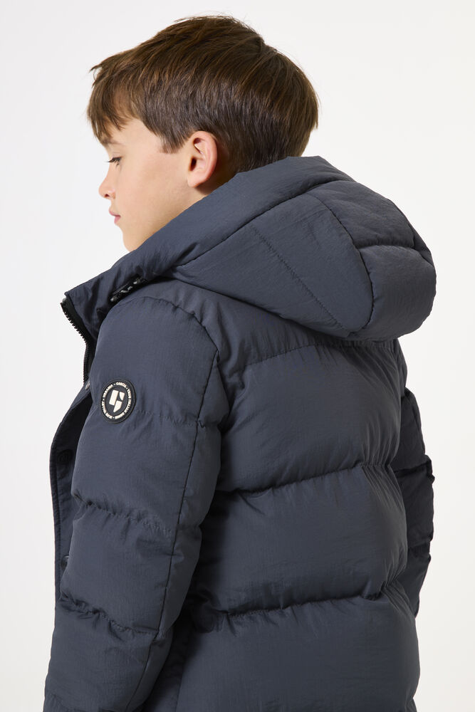 Halflange gewatteerde puffer met capuchon. Deze gewatteerde jas is gemaakt van waterafstotend materiaal en gevoerd met een zachte imitatie dons vulling voor comfort en warmte. Verder heeft deze jas lange mouwen, een ritsluiting met windflap met drukknopen, steekzaken en een regular fit. De buitenlaag van deze jas is gemaakt van 100% polyester.