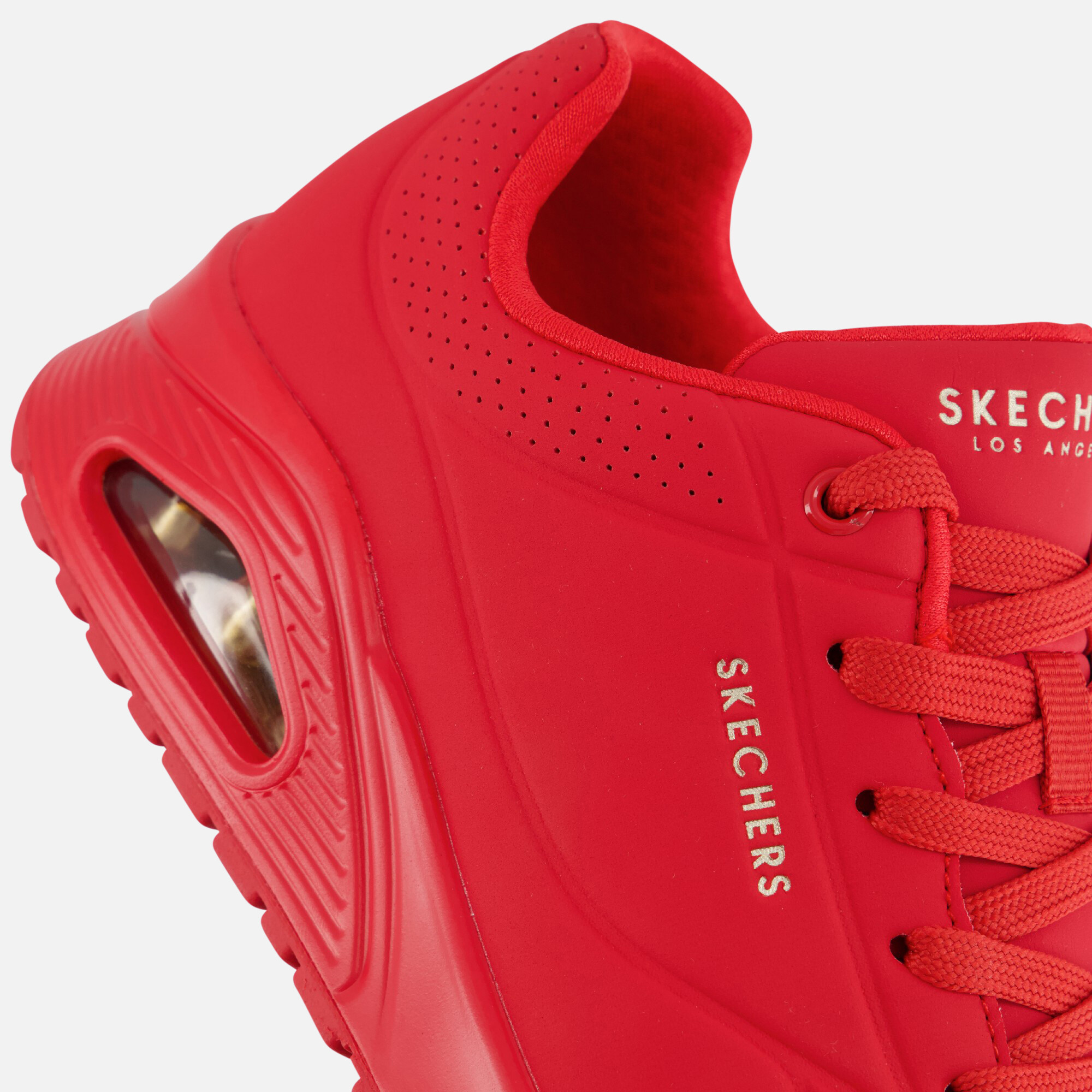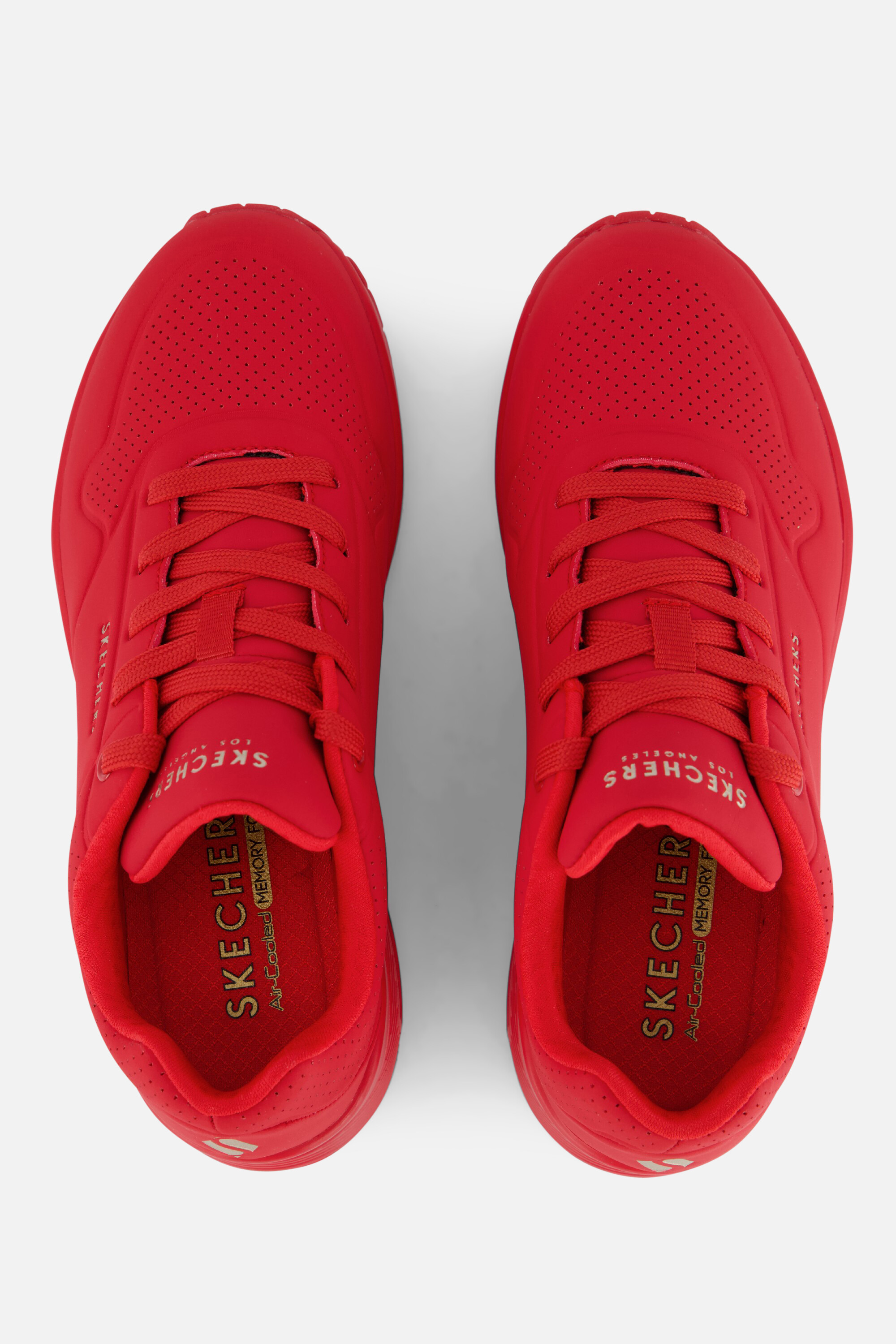 Deze rode Skechers Uno Stand On Air sneakers hebben een synthetisch bovenwerk. De voering en comfortabele binnenzool zijn van textiel. De sneakers hebben binnenzool met air-cooled memory foam en een zichtbare Skech Air tussenzool. De zool is gemaakt van rubber en heeft een dikte van 3 centimeter.