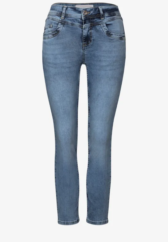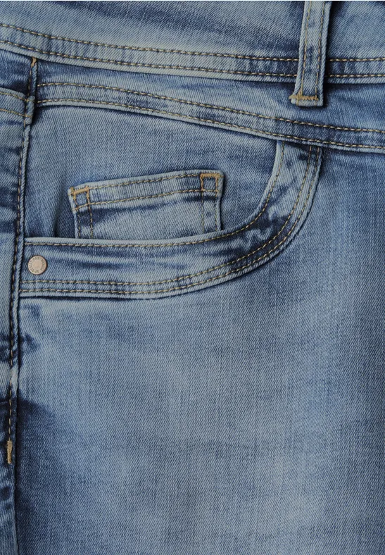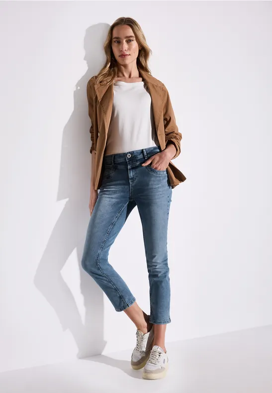 Deze 7/8 jeans van Street One voor dames maakt indruk met zijn casual pasvorm en moderne Mid Waist. De Slim Legs geven ze een vrouwelijk silhouet, terwijl de blauwe wassing op verschillende manieren gecombineerd kan worden. De katoenmix met stretch zorgt voor een hoog draagcomfort.