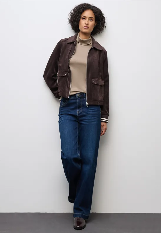 Het korte jack in trenchcoat-look van Street One voor dames in een geraffineerde velourslook voegt elegantie toe aan je garderobe. De reverskraag en d...