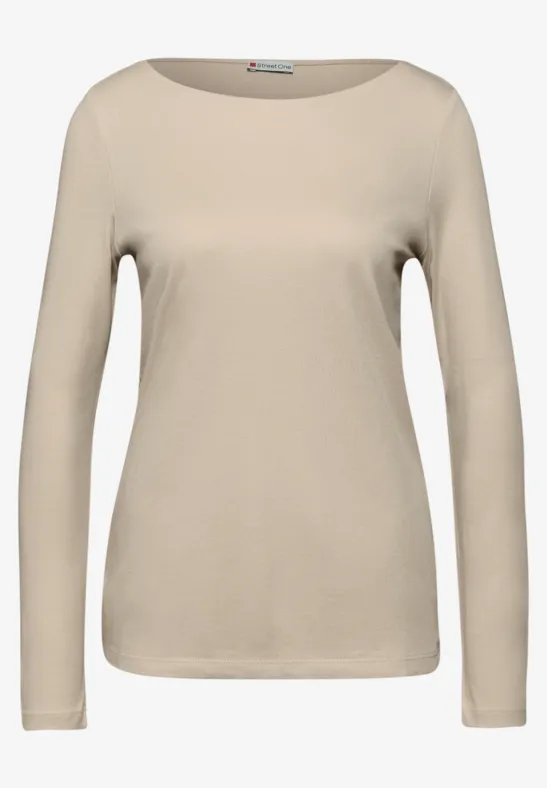 Het basic Lanea shirt met lange mouwen van Street One voor dames is een echte essential met mooie details. De dubbellaagse voorkant van zuiver katoen zorgt voor een aangenaam ondoorzichtige look, terwijl de boothals het Shirt een vrouwelijke touch geeft. Een veelzijdige must-have voor elke dag.