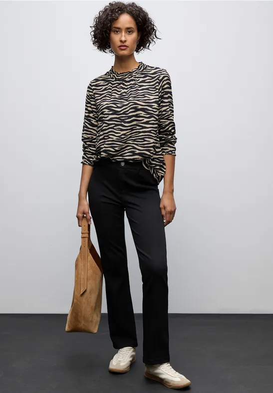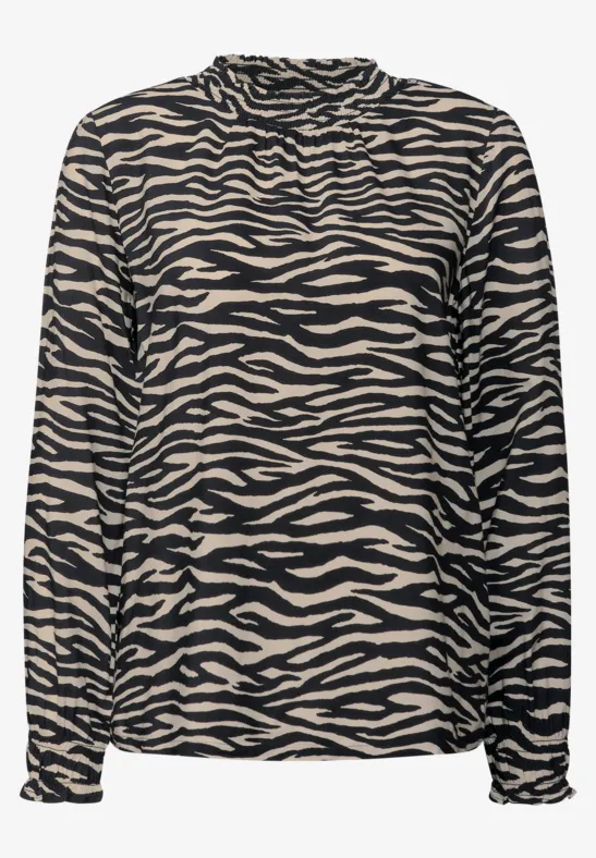 Deze damesprintblouse van Street One heeft een modieuze dierenprint en vrouwelijke smokdetails. De hoge col zorgt voor een stijlvol accent, terwijl de zachte viscose comfortabel aanvoelt op de huid. Een trendy highlight voor een zelfverzekerde look.