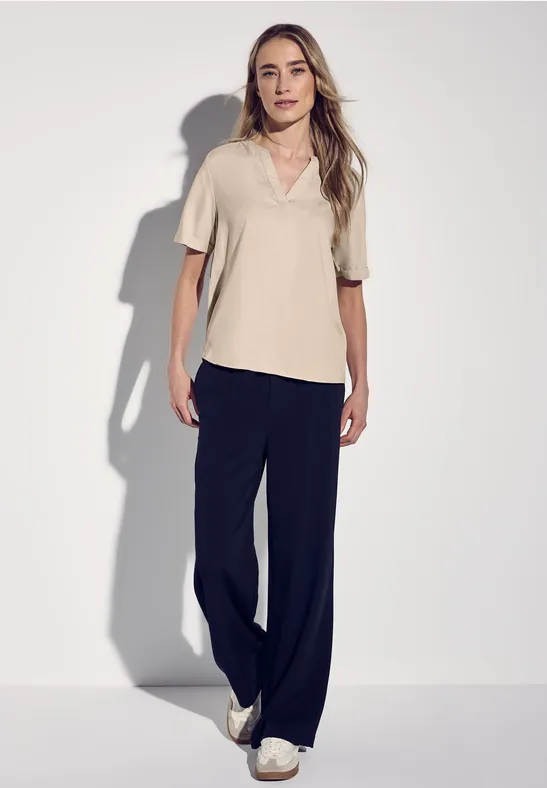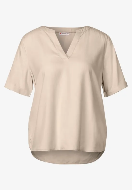 Deze effen blouse van Street One voor dames heeft een ronde halslijn met split en korte mouwen. De zachte viscose geeft hem een vloeiende look en is zeer comfortabel om te dragen.
