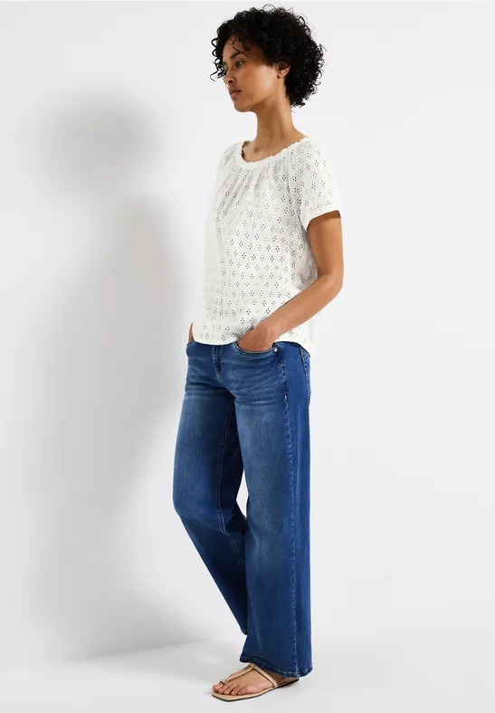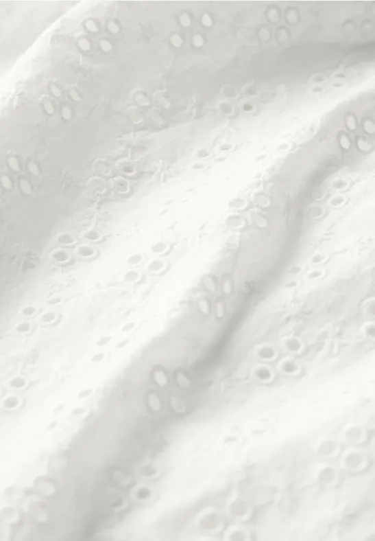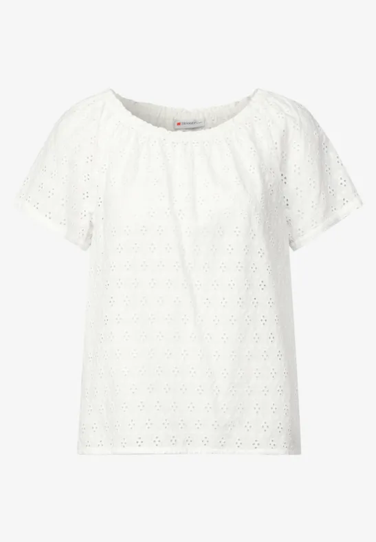 Deze Carmen blouse van Street One voor dames zet modieuze accenten met het zomerse eyeletborduursel. De Carmen-halslijn en korte mouwen geven hem een vrouwelijke touch. Het zuivere katoen maakt hem comfortabel om te dragen.
