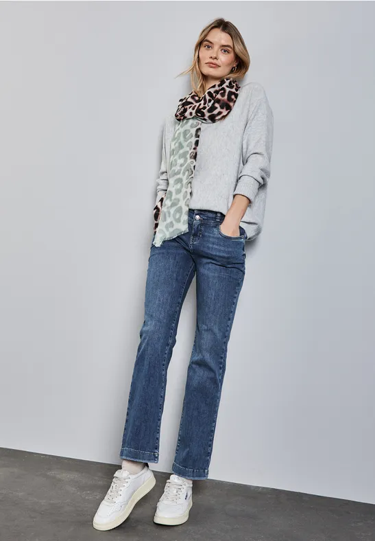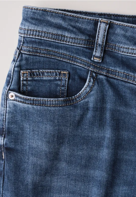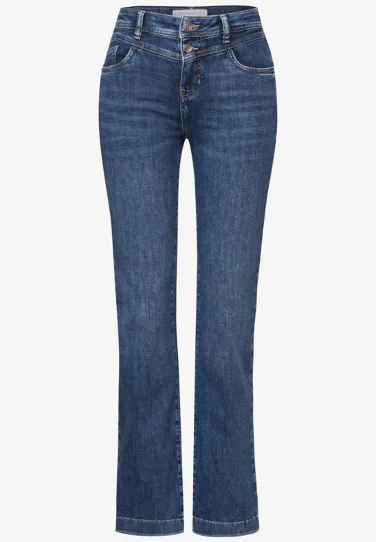 Deze slim fit bootcut jeans van Street One voor dames maakt indruk met zijn hoge taille en klassieke blauwe wassing. De figuurflatterende bootcut pijpen en de katoenmix met stretch zorgen voor een hoog draagcomfort.