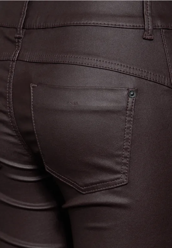 De coated slim fit broek van Street One voor dames is een lederlook broek met een middelhoge taille en slanke pijpen. De materiaalmix met stretch en de steekzakken maken hem uiterst comfortabel om te dragen. De York style broek is perfect voor een modieuze look.