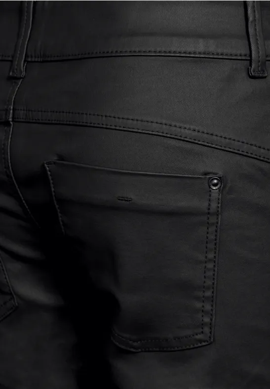 De coated slim fit broek van Street One voor dames is een lederlook broek met een middelhoge taille en slanke pijpen. De materiaalmix met stretch en de steekzakken maken hem uiterst comfortabel om te dragen. De York style broek is perfect voor een modieuze look.