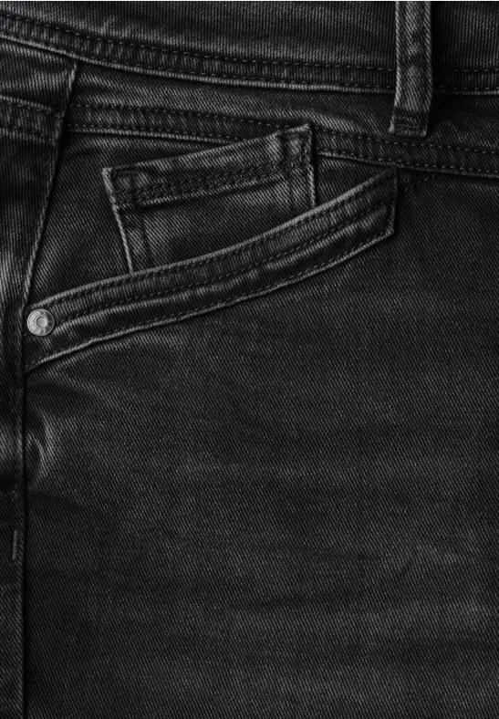 Deze Street One mom jeans voor dames heeft een High Waist pasvorm en taps toelopende pijpen. De zwarte wassing geeft ze een moderne touch. De katoenmix met stretch zorgt voor een comfortabele pasvorm.