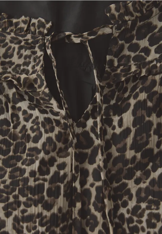 Deze zacht gedrapeerde damesblouse met lange mouwen van Street One zet stijlvolle accenten met zijn dierenprint en fijne ruches. De gespleten hals met bandjes en de elastische manchetten zorgen voor een vrouwelijk silhouet.
