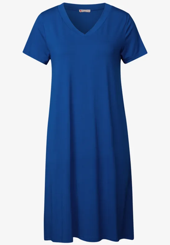 Deze knielange jersey jurk van Street One voor dames heeft een eenvoudige effen kleur en een modern model. De ronde V-hals en korte mouwen geven hem een vrouwelijke touch. Dankzij de viscosemix met stretch is hij bijzonder comfortabel om te dragen.