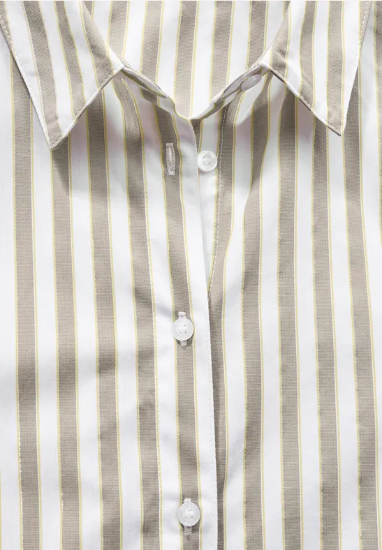 Deze gestreepte overhemdblouse van Street One voor dames biedt een klassieke look met zijn overhemdkraag en afgeronde zoom. De lange mouwen met manchetten en het streeppatroon maken het een veelzijdige must-have. Het subtiele glittereffect zorgt voor sfeervolle outfits.