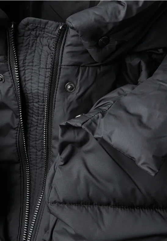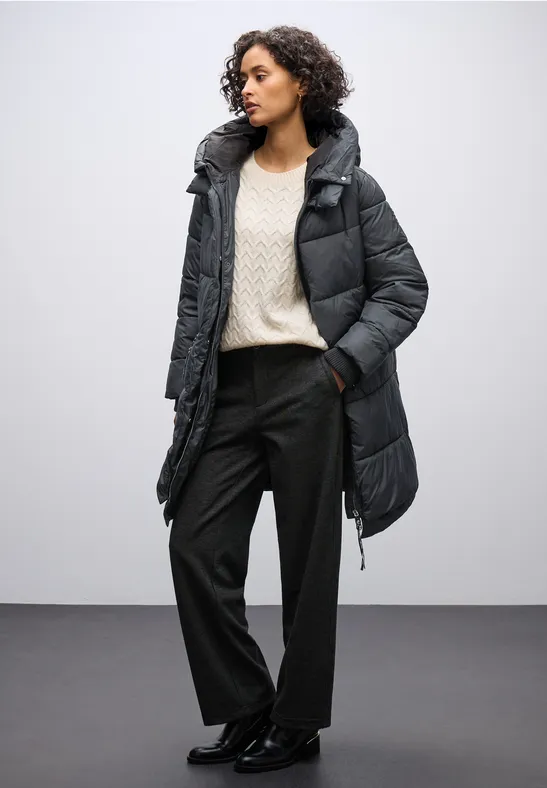 De lange jas van Street One voor dames maakt indruk met zijn geraffineerde ontwerp en behaaglijke warmte. De capuchon met opstaande kraag, 2-wegritssluiting en zijzakken met ritssluiting maken hem bijzonder functioneel. De zachte manchetten en gevoerde binnenkant zorgen voor optimaal comfort.