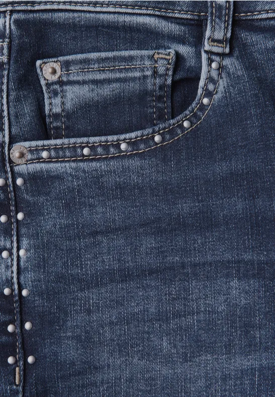 Deze York-jeans van Street One voor dames heeft klinknageldetails en een split bij de zoom voor een modieus accent. De High Waist en Slim Legs zorgen voor een aansluitende pasvorm, terwijl de stretch katoenmix zorgt voor draagcomfort.