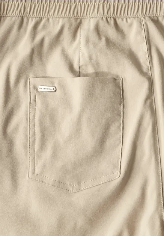 Deze damesbroek van Street One combineert een ontspannen Loose Fit met steek- en opgestikte zakken. De Mid Waist en Slim Legs creëren een modern silhouet, terwijl de elastische tailleband met trekkoord maximaal comfort biedt.