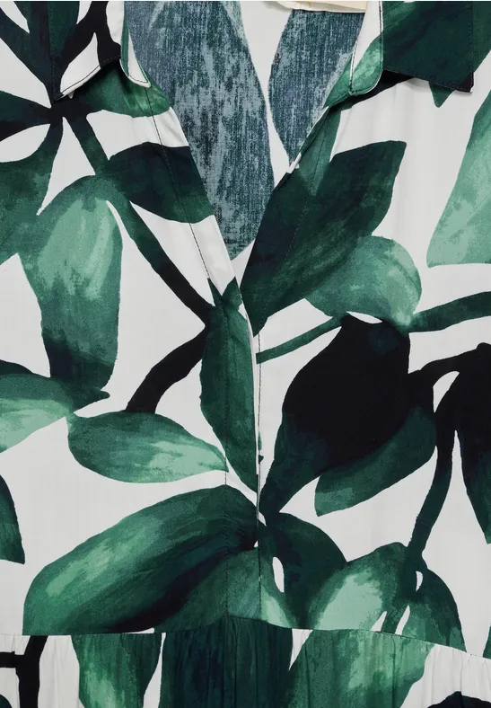 Street One midi-jurk met print, kuitlange zomerjurk, kraag en V-hals, 3/4-mouwen met knoop en bandjes, zachte viscosestof