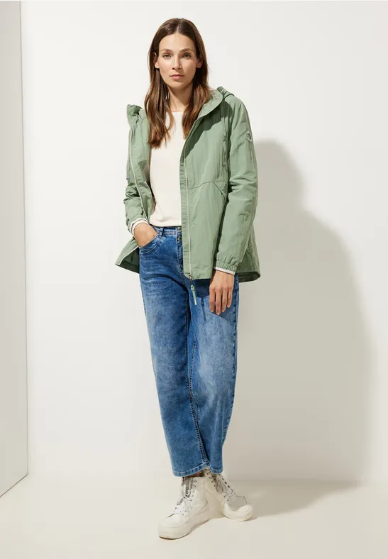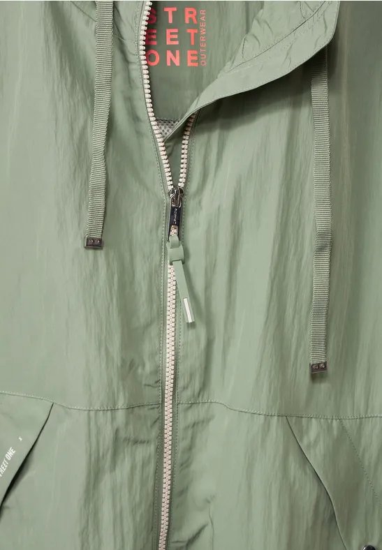 Street One windjack voor dames, effen kleur, rits, capuchon, band met trekkoord, zakken, modern, elastische zoom met contrasterende strepen