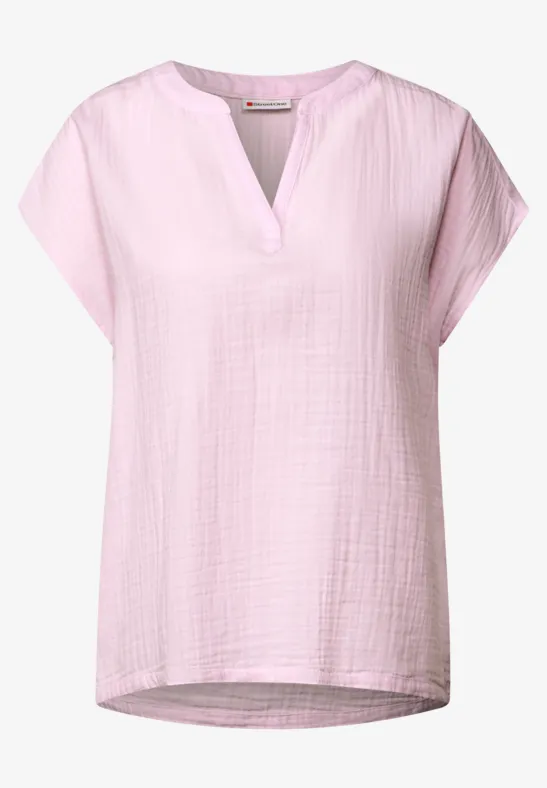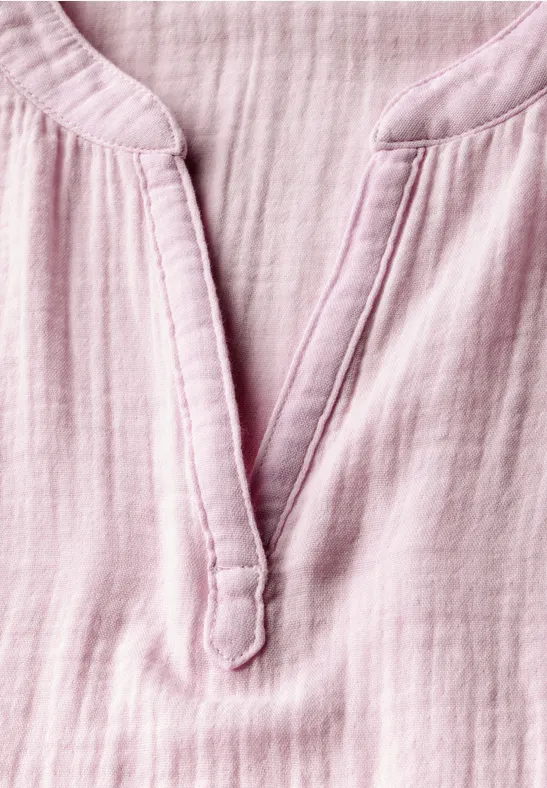 Deze mousseline blouse van Street One voor dames heeft een openvallende halslijn en maakt indruk door de zachte katoenen stof met een fijne textuur. De overhangende schouders geven de blouse een casual look en maken hem de ideale metgezel voor je dagelijkse outfits.