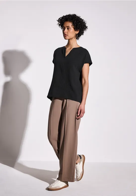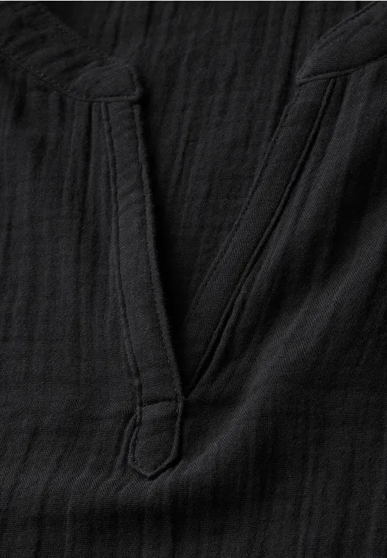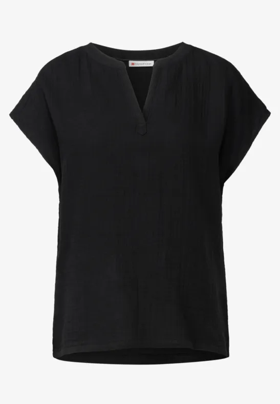 Deze mousseline blouse van Street One voor dames heeft een openvallende halslijn en maakt indruk door de zachte katoenen stof met een fijne textuur. De overhangende schouders geven de blouse een casual look en maken hem de ideale metgezel voor je dagelijkse outfits.