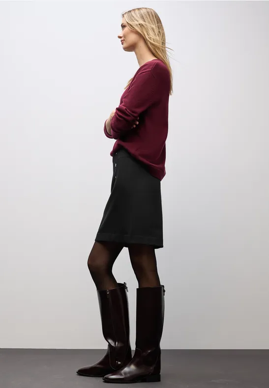 Deze rok in Maja-stijl van Street One voor dames heeft decoratieve knoopdetails aan de voorkant. De ritssluiting achter zorgt voor een goede pasvorm, terwijl het knielengte model vrouwelijke elegantie uitstraalt. De comfortabele pasvorm maakt hem ideaal voor dagelijks gebruik en op kantoor.