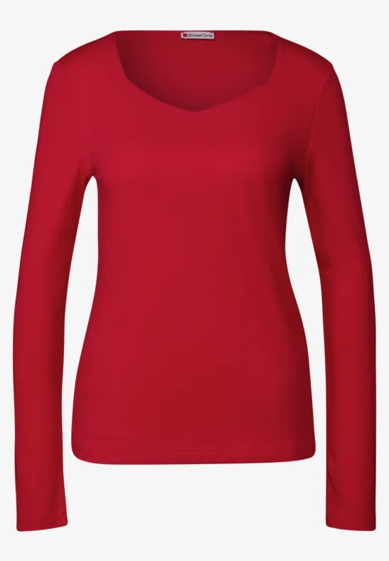 Het Street One shirt voor dames met lange mouwen heeft een charmante sweetheart halslijn en een ondoorzichtige, dubbellaagse voorkant. De zachte katoe...