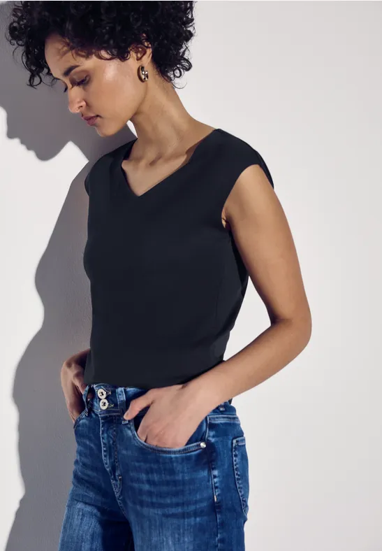 Deze mouwloze top van Street One voor dames combineert de vrouwelijke look van een blouse met het comfort van zachte jersey. De halsuitsnijding met sp...