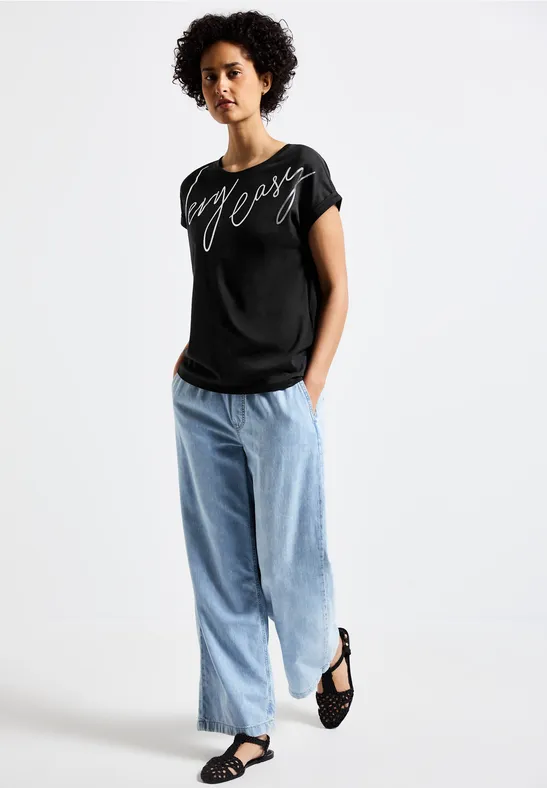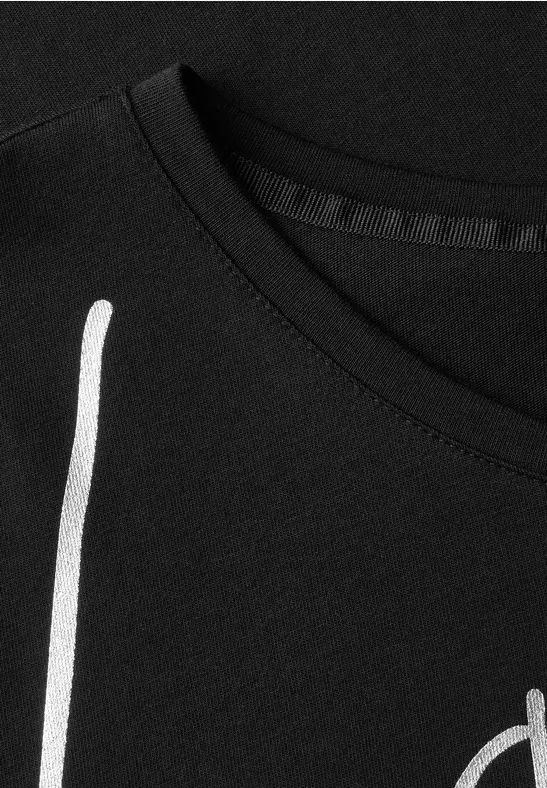 Dit zomerse damesshirt van Street One valt op door de glitterende foliebelettering op de voorkant. De ronde halslijn en ontspannen afhangende schouders maken het een casual blikvanger. De zachte katoen-modaalmix maakt het bijzonder comfortabel om te dragen.