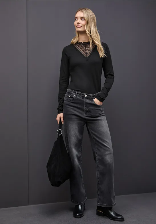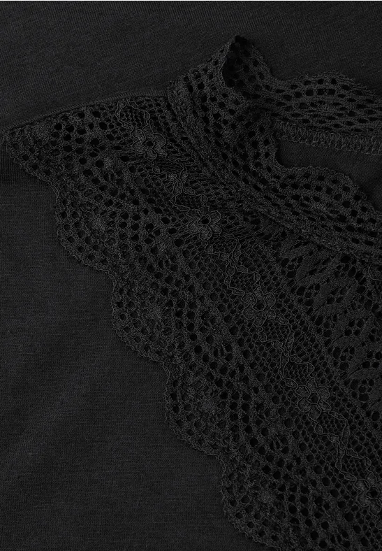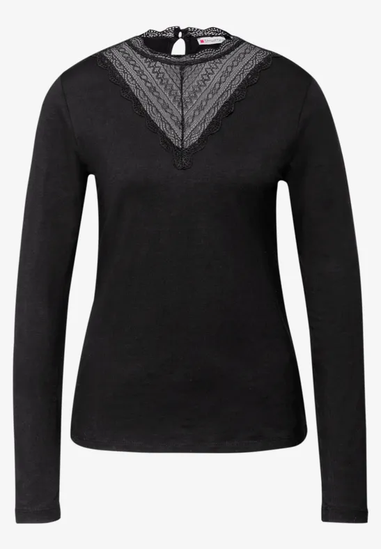 Dit Street One damesshirt met lange mouwen combineert een zachte modalmix met fijne kanten details bij de halslijn en op de mouwen. De effen look maakt het een vrouwelijke allrounder voor vele gelegenheden.