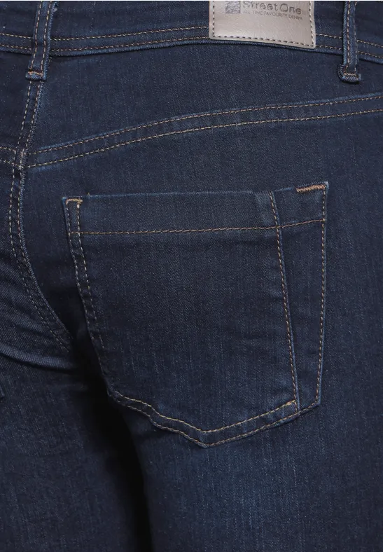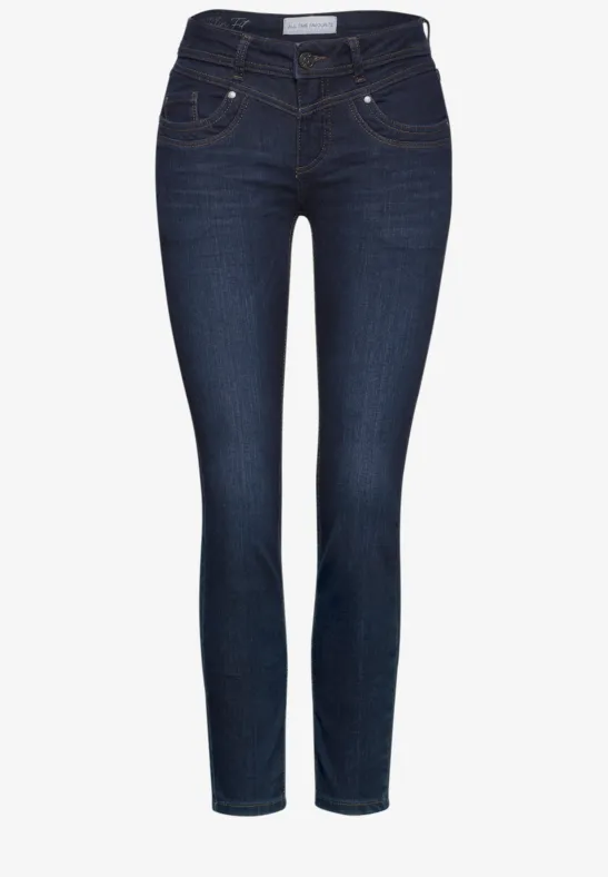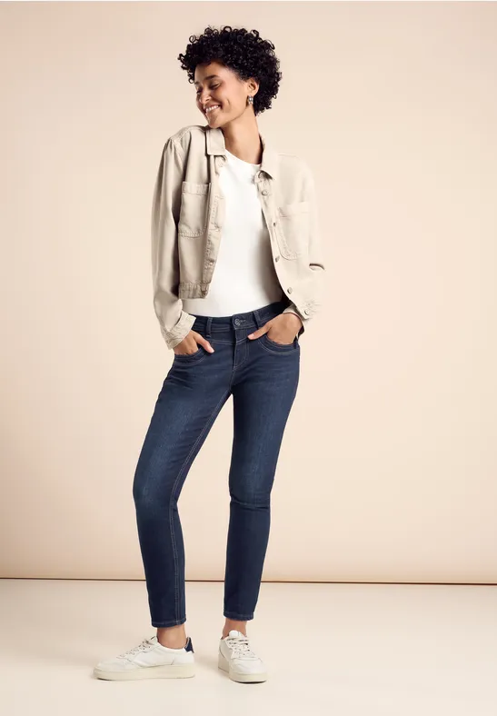 Street One damesjeans slim fit, jeansbroek, middellange taille met slanke pijp, knoop en ritssluiting, 5-pocket, katoenmix met stretchgehalte