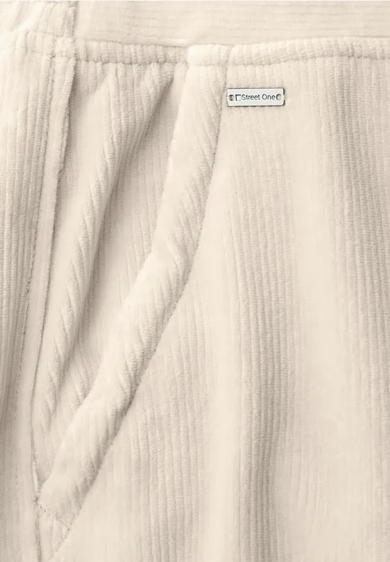 Deze corduroy broek van Street One voor dames heeft een casual pasvorm met rechte pijpen en een hoge tailleband. Het zachte brede ribfluweel maakt hem comfortabel om te dragen, terwijl de elastische tailleband aan de achterkant en de steekzakken het comfort benadrukken. Een casual metgezel voor stijlvolle herfst- en winterlooks.