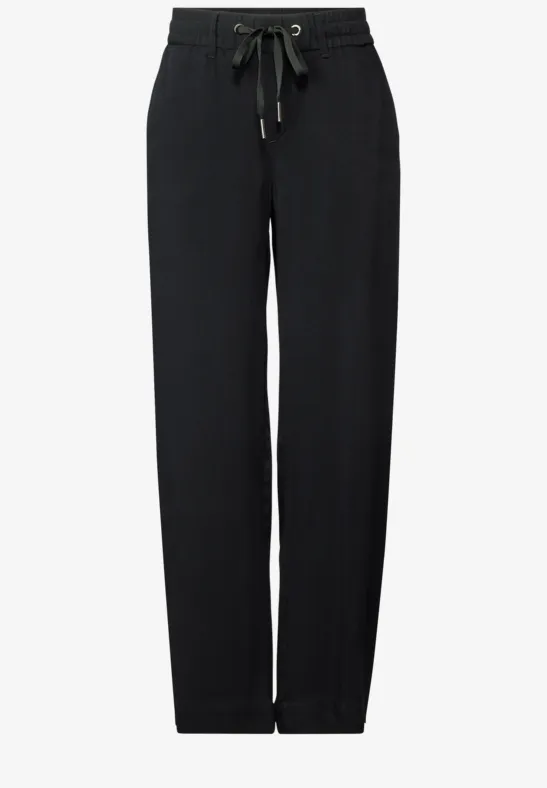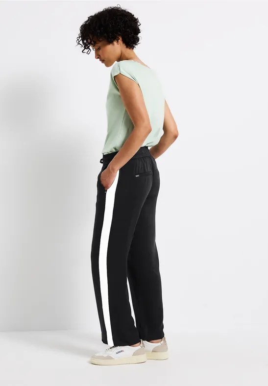 Deze Straight Legs broek van Street One voor dames maakt indruk met zijn Loose Fit en Mid Waist. Een streep opzij voegt een sportief accent toe, terwijl de elastische tailleband met trekkoord zorgt voor een comfortabele pasvorm. De lichtgewicht viscose stof maakt hem ideaal voor warme dagen.