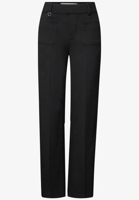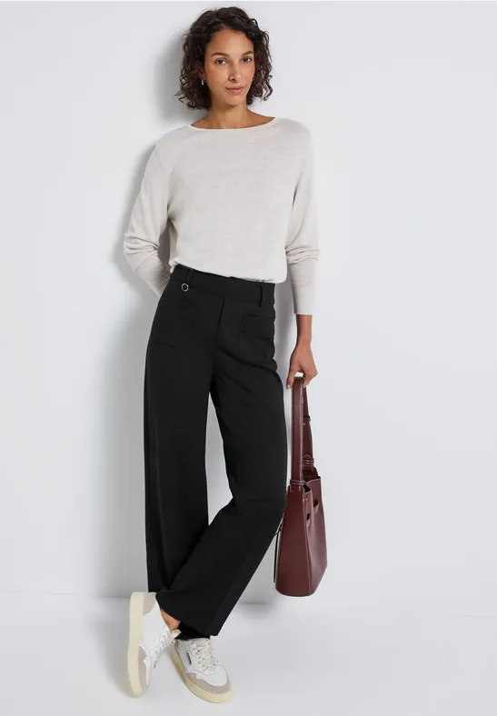 Deze Street One-broek voor dames combineert een vrouwelijke casual pasvorm met comfortabele Straight Legs en een High Waist. Opgestikte zakken en een stijlvol detail op de riemlus voegen modieuze accenten toe. De punto di roma stof met stretch zorgt voor een comfortabele pasvorm en vormvastheid.