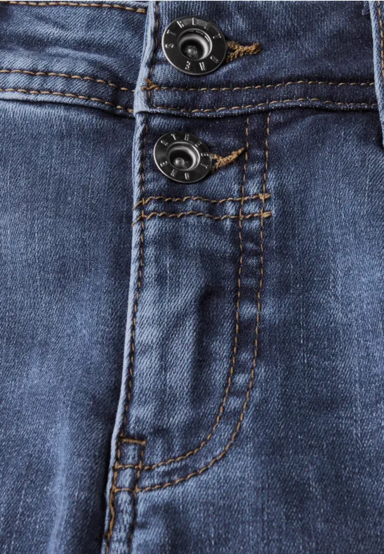 Deze Straight Legs jeans van Street One voor dames heeft een klassieke donkerblauwe wassing en een comfortabele casual pasvorm. De rechte pijpen en Mid Waist zorgen voor een ontspannen pasvorm. De stretchy katoenmix biedt comfortabele bewegingsvrijheid - perfect om elke dag te dragen.