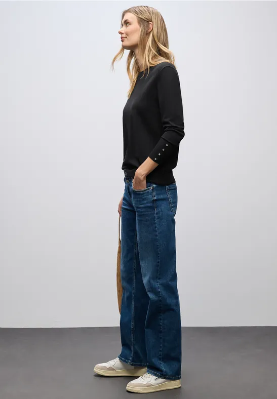 De Street One basic trui voor dames heeft een klassieke look en fijne details. Discrete knoopdetails op de mouwen zorgen voor subtiele accenten, terwijl de ronde halslijn en het zachte materiaal zorgen voor een comfortabele pasvorm. Een veelzijdige metgezel voor elke dag.