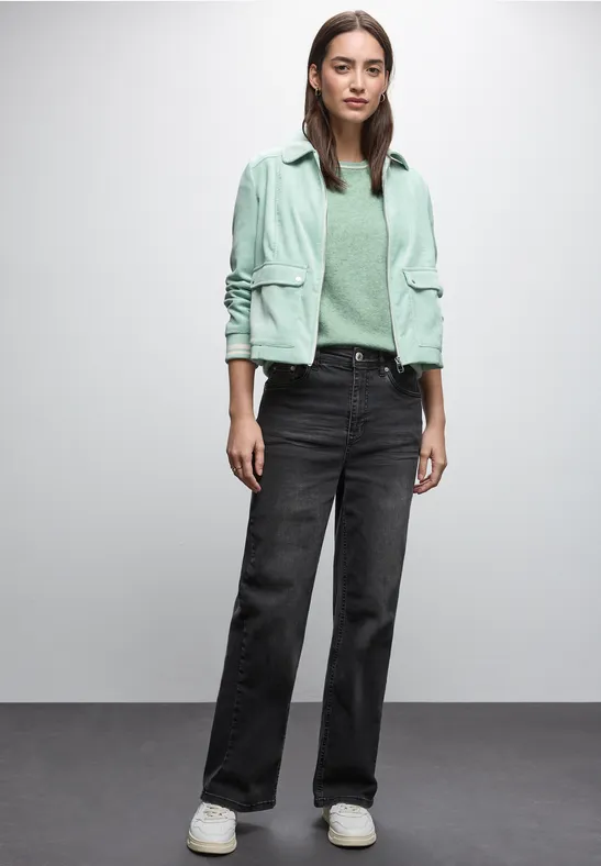 Street One casual fit damesbroek, middelhoge taille, strakke pijpen, keperstof, ritsdetails, steekzakken