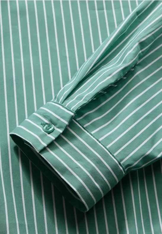 De gestreepte lange blouse van Street One voor dames heeft een overhemdkraag en een afgeronde zoom. De omgeslagen mouwen en de stretch katoenmix bieden comfort en stijl voor een zakelijke look.