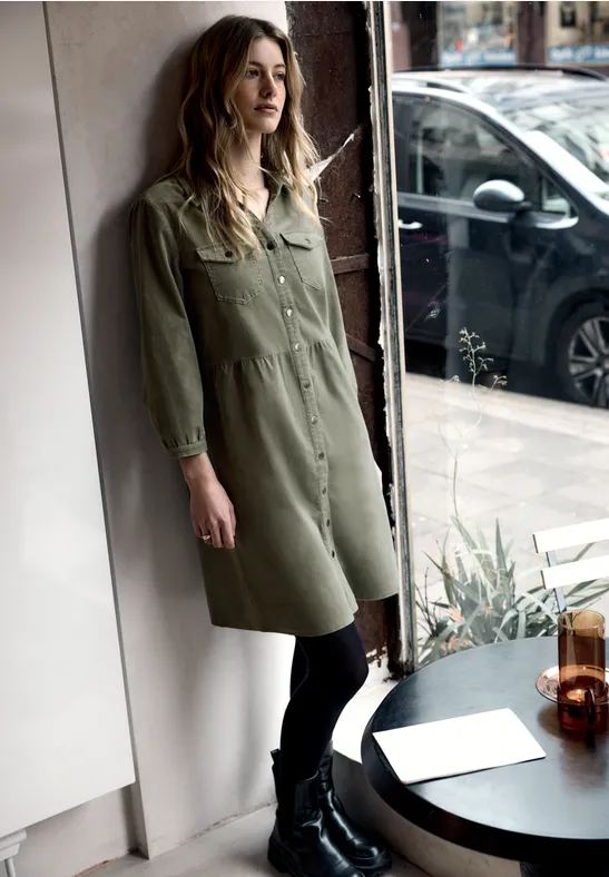 De knielange corduroy jurk met volant van Street One Studio voor dames combineert vrouwelijke details met een casual overhemdlook. De overhemdkraag, knoopsluiting en borstzakken met knopen benadrukken het ontwerp, terwijl de zachte corduroy stof zorgt voor een comfortabele pasvorm. Ideaal voor stijlvolle alledaagse outfits.