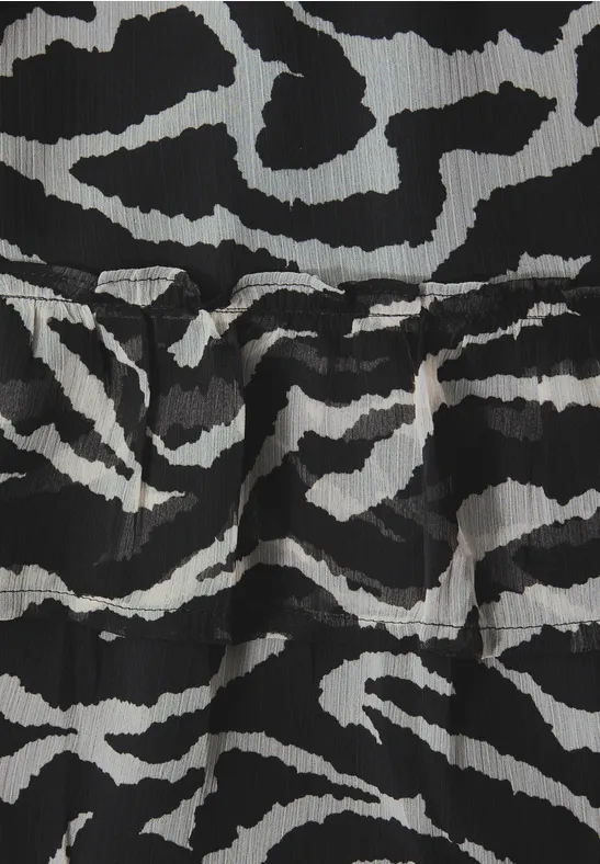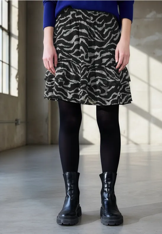 Deze chiffon rok van Street One Studio voor dames combineert een grafisch patroon met vrouwelijke volants en steekzakken. De elastische tailleband zorgt voor een comfortabele pasvorm, terwijl het knielengte silhouet ideaal is voor stijlvolle alledaagse outfits. Een luchtige stijl met urban flair.