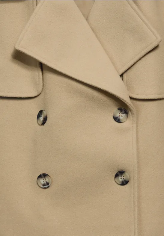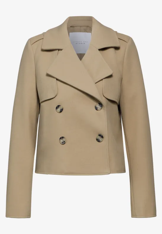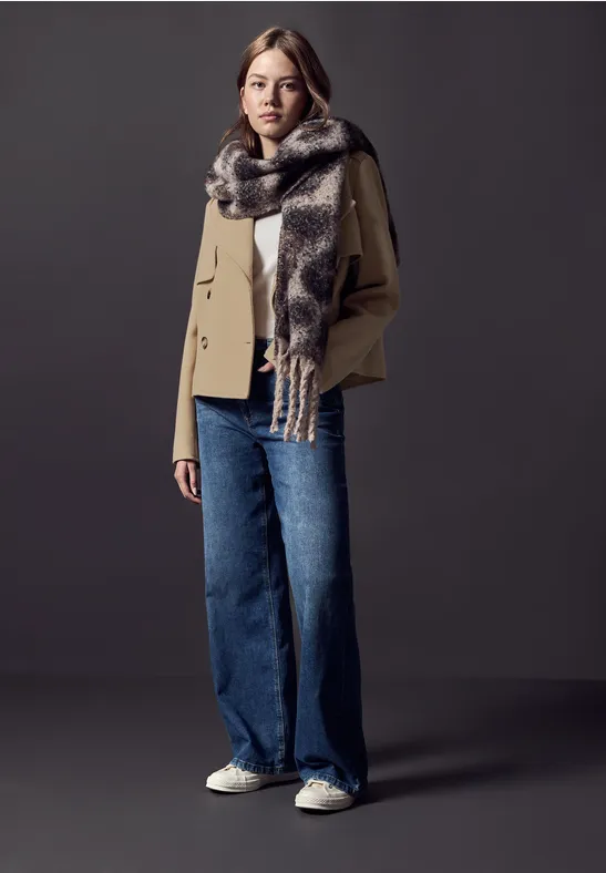De korte trenchcoat van Street One Studio is een modieuze highlight voor je garderobe. Met zijn reverskraag en klassieke knoopsluiting geeft hij je look een stijlvolle touch. De zachte materiaalmix maakt hem comfortabel om te dragen.
