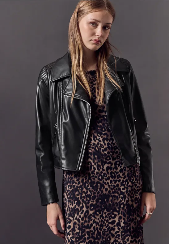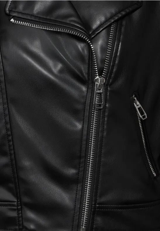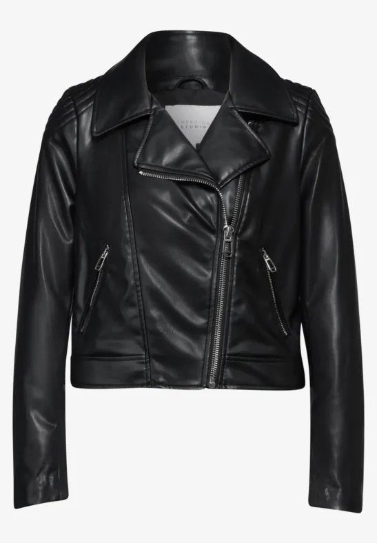 Dit lederlook bikerjack van Street One Studio voor dames is een echte blikvanger. De reverskraag en schuine ritssluiting geven het jack zijn karakteristieke look. Perfect voor stoere en casual outfits.