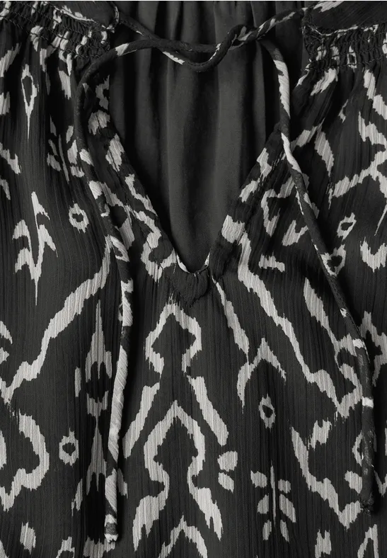 De chiffon raglan blouse van Street One Studio voor dames heeft een fijne textuur en een grafisch patroon. Vrouwelijke smokdetails en een split in de hals met bandjes geven de tuniek een bijzondere flair. De lange mouwen zijn licht doorschijnend en maken de modieuze look van deze lichtgewicht blouse helemaal af.