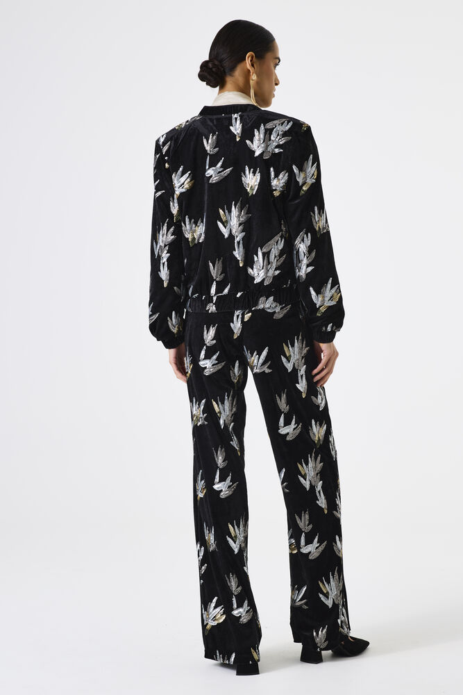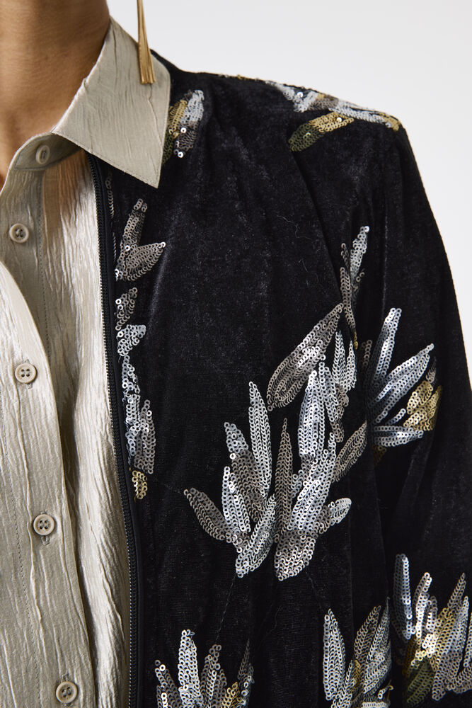 Velvet jack met pailletten. Dit jack heeft een ronde hals, lange mouwen en sluit met een ritssluiting, wat zorgt voor een comfortabele regular fit. Dit item is gemaakt van 96% polyester en 4% elastaan, waardoor het zacht aanvoelt en een luxe uitstraling heeft.
